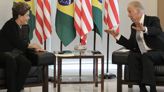 The president of Brazil, Dilma Rousseff speaks with the vice president of the United States, Joe Biden.