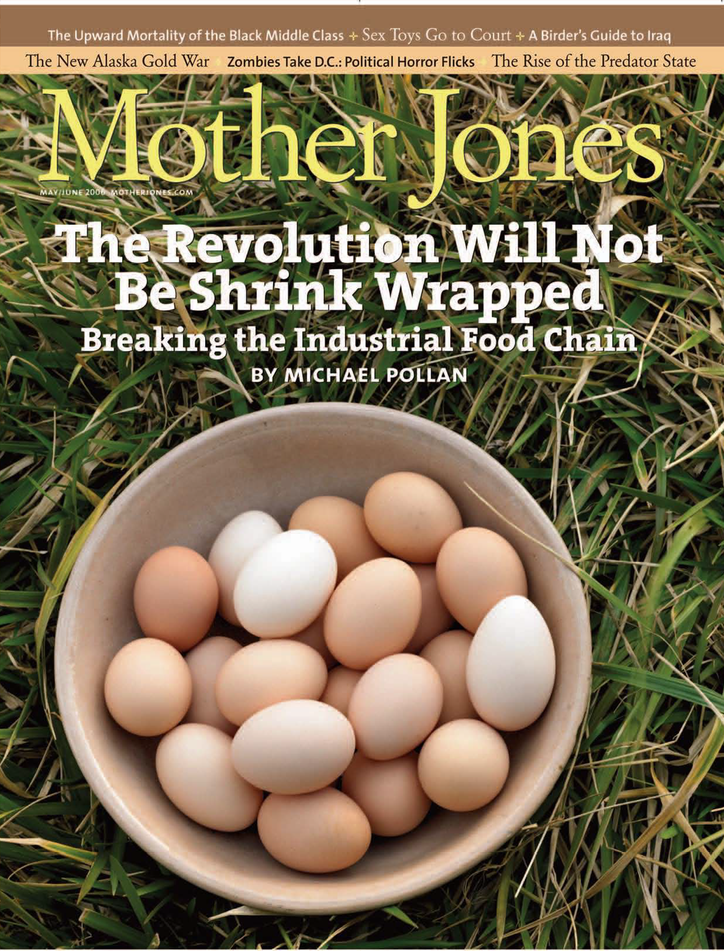 November/December 2006 Cover story: The Thirteenth Tipping PointHype vs. Hope;The Carpet Cleaner; Lead Astray; When Is a Corporation Like a Freed Slave?; Is Google Evil?; Revenge of the Nerds; more… September/October 2006 Cover story: Lie by Lie: The Mother Jones Iraq War Timeline (8/1/90 – 2/14/08)Exodus;Just Try Voting Here; Revolt of the Elders; A is for Afro; Sweet Subpoena; A Detainee’s Story ; more… July/August 2006 Cover story: Breeder ReactionSouls On Ice;Waiting to Happen; Three Days in Rome; Next We Take Tehran; Rock the Junta; more… May/June 2006 Cover story: No Bar CodeThe Midas Touch;The Bible Bench; Upward Mortality; more… March/April 2006 Cover story: Last Days of the OceanHeroes in Error;The Street Samaritans; In a Brothel Atop Street 63;more… January/February 2006 Cover story: From Freedom Fries to FuneralsThe McCain (et al.) Mutiny; Among the Allies; more… Go back to main archives page
