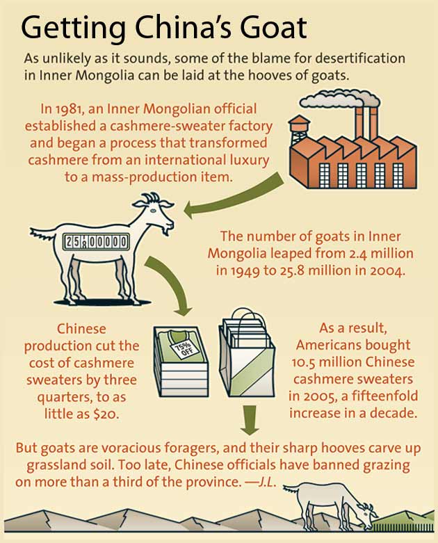 Between bouts of business talk, I learned that the region’s environmental decline began during the Cultural Revolution, when too many sheep were raised and too many trees were felled. As capitalism gained momentum in the 1980s, Mr. Li said, peasants needed wood for fences to demarcate their newly privatized fields, and tree cutting accelerated. At the same time, the government dispersed many Han Chinese into the traditionally Mongolian province—to the point that it is now 80 percent Han. The grassland succumbed to the intensified grazing, and storms threw sand across the landscape.