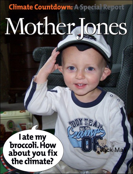Want to remind your politicians (and your friends) that this is not about special interests, but the future of all of us? And also have a whole lot of fun? Try our interactive application where you can create a personalized cover of Mother Jones‘ special issue on climate. In less than 24 hours, Mother Jones readers have made close to a thousand covers. Here are some: