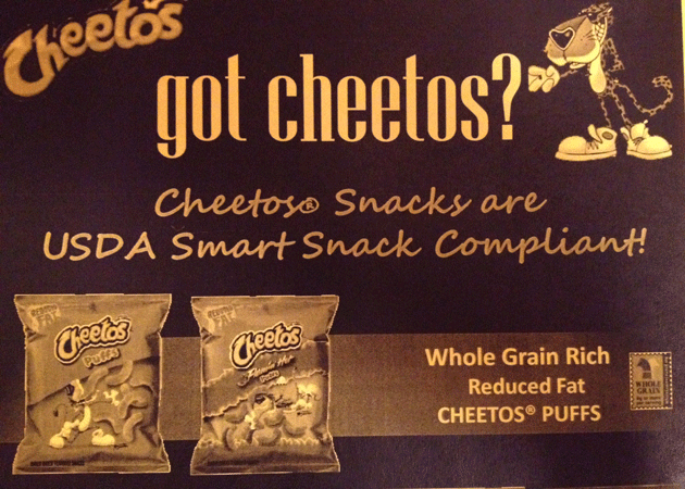 Indeed, the exhibitors’ guiding principle seemed to be something like: “Whatever you do, don’t tell them it’s healthy.” I watched as a Sara Lee rep promised a cafeteria director from Louisiana that her students wouldn’t be able to detect the whole-grain flour in her company’s chocolate muffin. The PepsiCo booth stocked a flyer (below) informing attendees that newly formulated Cheetos fit with the guidelines. When I sampled a vitamin-fortified, low-cal Slush Puppy, the rep asked me, “Doesn’t that taste just as good as a regular slushy?” (It didn’t.) A food service company rep promised me that his funnel cake was “plenty sweet,” even though it fit within the calorie limits. (It was.)