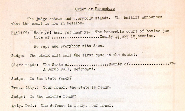 In addition to an optional funeral oration for the scrub sire and detailed instructions regarding the barbecue or other refreshments (“bologna sandwiches, boiled wieners, or similar products related to bull meat” are recommended), the pamphlet also includes a script that begins with the immortal lines: “Hear ye! Hear ye! The honorable court of bovine justice of ___ County is now in session.” The county’s case against the scrub bull is laid out: that he is a thief for consuming “valuable provender” while providing no value in return, that he is an “unworthy father,” and that his very existence is “detrimental to the progress and prosperity of the public at large.” Several pages and roughly two hours later, the trial concludes with the following stage direction: “The bull is led away and a few moments later a shot is fired.”