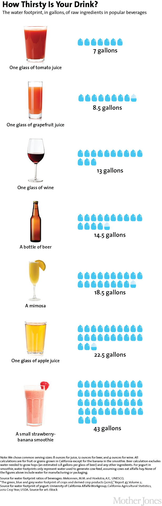 In the past, we’ve shown you how many gallons of water go into irrigating crops like almonds, tomatoes, and alfalfa. The chart below shows the amount of water needed to irrigate the California-grown raw ingredients in common drinks. (We chose common serving sizes for each beverage: 8 ounces for juice, 12 ounces for beer, and 4 ounces for a glass of wine.)