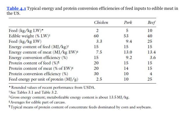In even the most efficient, high-tech farms, it takes a pound and a half of grain to grow a pound of chicken—because that chicken is constantly radiating heat and burning energy to move around. The picture gets worse if you just look at the parts of the chicken that people like to eat. The scientist Vaclav Smil, who has a reputation for objective number-crunching, considered this basic issue of thermodynamics in his book, Should We Eat Meat? Evolution and Consequences of Modern Carnivory, and came up with this table: