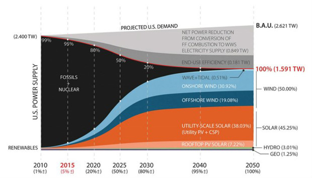For their renewable energy roadmap study, Stanford professor Mark Jacobson and his team used US Energy Information Administration data to project “business as usual” energy consumption in 2050. They then compiled state-by-state energy portfolios needed to meet that projected demand demand through expanded wind, water, and solar energy generation.