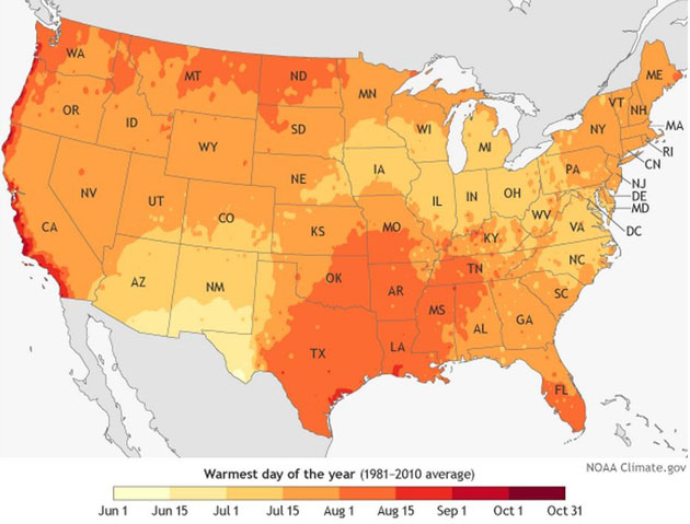 June marks the height of the sun’s radiation barraging the Northern Hemisphere, but temperatures keep rising because the “rate of heat input from the sun during the day continues to be greater than the cooling at night,” writes NOAA. That means most places don’t hit their most torrid days until mid-July to mid-August. Here’s the atmospheric agency further parsing the geography of America’s heat: