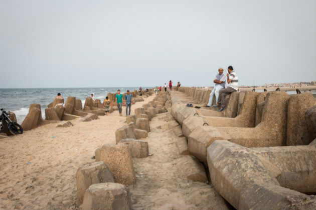 In the popular coastal resort town of Baltim, about 30 miles north of Kafr el-Sheikh, mango farmer Mossad Abu Ghali has seen the sea advancing. “I remember when they had to build a new boardwalk because the old one got ruined by the sea,” Abu Ghali says. “That was a long time ago though. Inshallah, the sea is not advancing anymore.” Baltim built a seawall in 1992 out of large, concrete tetrapod blocks. This has slowed—but not stopped—the sea’s advance. This type of structure, known as a revetment, has an average life span of 30 to 50 years. Already the wall is half-buried in sand.