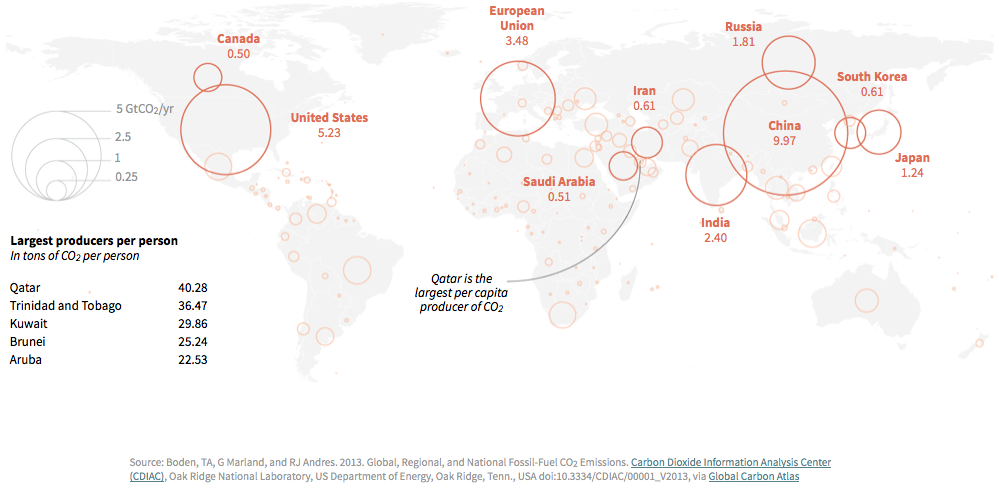The 10 largest emitters produced about 26.4 gigatons of carbon dioxide in 2013. (A gigaton is 1 billion tons, or roughly the equivalent of the annual emissions from every passenger car in the US each year.) They are highlighted in red.