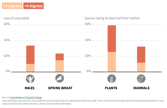 Each year, more species are losing their habitats to climate change. An increase of 4 degrees Celsius in average planetary temperatures could result in severe habitat loss for almost two-thirds of plant species and one-third of mammal species. (All charts by The Huffington Post.)
