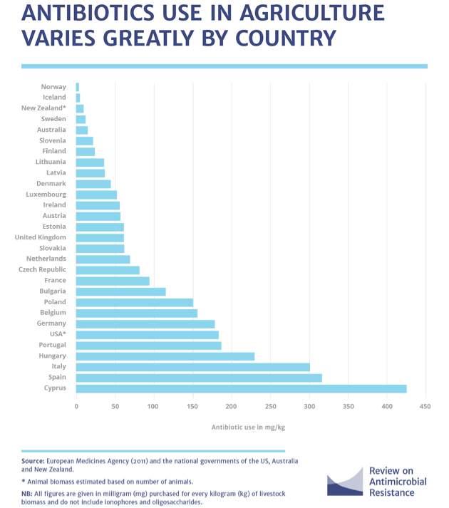 As the chart below shows, antibiotic usage varies widely by country. Some farmers argue that reducing antibiotic use will decimate the meat industry, but the report counters that “there is growing evidence to suggest that antibiotics used as growth promoters do not have as much economic benefit as previously thought”—especially in countries with advanced farming techniques. Denmark, for example, uses a relatively small amount of drugs—yet has become one of the largest exporters of pork in the world.