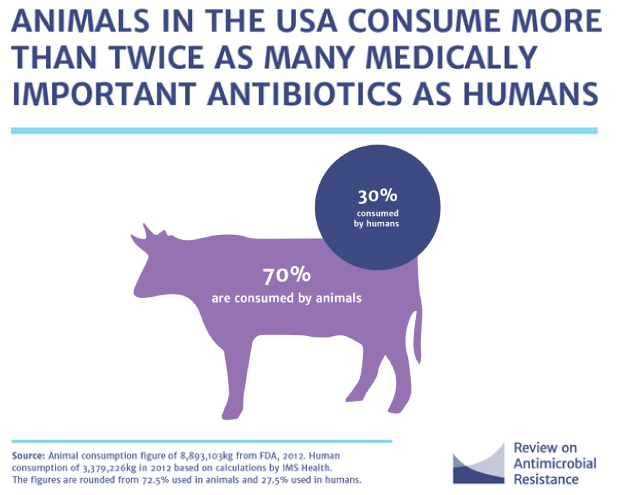 As my colleague Tom Philpott has pointed out again and again, our habit of dosing farm animals with antibiotics is causing big problems. According to a new report commissioned by UK Prime Minister David Cameron and published in the Review on Antimicrobial Resistance, many countries now use more antibiotics for animals than for humans.