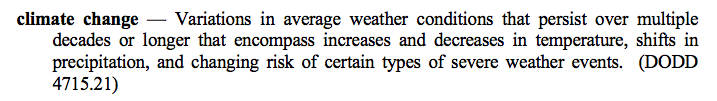 The Department of Defense has long acknowledged the threat to global and national security posed by climate change. But last week, the DoD officially included “climate change” in its official glossary for the first time. The addition was first noticed by the Federation of American Scientists. Here’s what the DoD settled on for its definition in the most recent Department of Defense Dictionary of Military and Associated Terms: “Variations in average weather conditions that persist over multiple decades or longer that encompass increases and decreases in temperature, shifts in precipitation, and changing risk of certain types of severe weather events.”