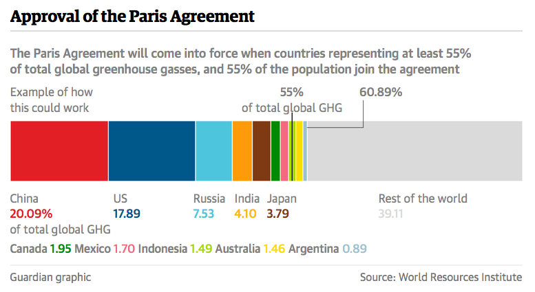 But it’s a tall order. The agreement needs to be approved by 55 countries accounting for at least 55 percent of global greenhouse gas emissions to come into force.