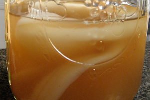 Because the fermentation happens naturally, I needed no special equipment besides a one-gallon mason jar to get the project bubbling. Brad Koester, a local kombucha brewer who also sells pickled beans and onions to San Francisco restaurants, presented me with my very own “mother” SCOBY; a gelatinous mass that resembled a small jellyfish asleep in amniotic fluid. I brewed about a gallon of green tea, added eight tablespoons of sugar, and poured all the liquid that would fit into the gallon jar with the SCOBY, making sure to cover the top of the mason jar with a thin cloth to prevent fruit fly infestation.
