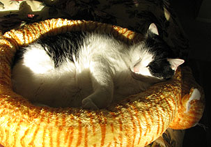 But there will be riots in the street (punctuated by the occasional snooze) if Inkblot and Domino are booted from their rightful spots as America’s Favorite Cats™ for two weeks in a row. So here they are. Domino is in her normal morning position, draped over Marian’s head and sucking up all her bodily warmth. Inkblot, whose relationship with the new pod is sometimes a fraught one, was in a pod-loving moment a few days ago and spent the morning curled up in the sunshine on the other end of the bed. Usually he disdains the pod and sleeps right by Marian’s feet, which basically makes her into a cat sandwich. On the other hand, my mother now has four cats, and apparently all of them like to sleep on the bed at night, so I guess it could be worse.