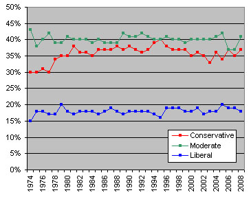 As you can see, nothing much has happened for the past three decades. In the mid-70s a bunch of “not sure” respondents decided they were conservatives after all, and since then the numbers have remained remarkably steady: about 18% identify as liberals, 37% as conservatives, and 40% as moderates. This hasn’t varied by more than three or four points since 1980. The most recent Harris data is for 2008, and breaks down 18% liberal, 37% conservative, and 41% moderate, right in line with the historical averages. It’s possible that something dramatic has happened since then, but Gallup aside, I wouldn’t count on it. Ten bucks says Harris gets pretty much the same results when they consolidate all the 2009 data at the end of the year.