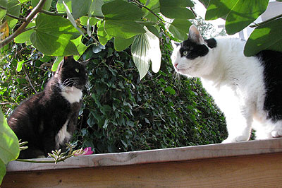 The fence is becoming an increasingly popular hangout spot. A couple of days ago both cats hopped up at once and created a logjam. Domino couldn’t figure out how to get down with Inkblot in the way, so she headed off in the wrong direction and got stopped by the rose bush. After convincing herself there was just no way through a big mass of thorns, she turned around and hopped down onto the air conditioning unit. Apparently Inkblot hadn’t counted on that bit of trickery, which meant there was no longer any point in blocking the way. So he headed over to the bird bath and hopped down too. I still don’t know for sure how they get up there, though.