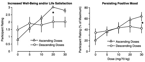 But now for the most interesting result: psilocybin produces not only mystical experiences, but joy, happiness, and positive social effects. And it does it for a long time: in followup interviews 14 months after the study was completed, nearly all the subjects still reported positive changes in their lives, especially if they received their psilocybin in increasing dosages. (Half the study volunteers got the highest dose first and worked down, and half started with the lowest does and worked up. All volunteers also got a placebo tossed in at some point.) Here are the geeky charts you’ve been waiting for: