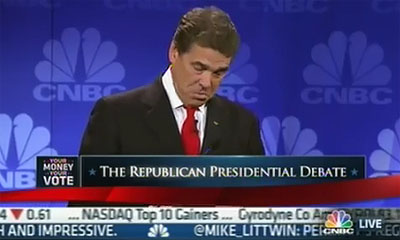 I think people in some ways are letting Perry off easy precisely because this “gaffe” was so egregious (we’ve all frozen up in front of audiences before. I think I can remember every time it’s happened to me with excruciating accuracy)….But put aside the queasy awkwardness of the moment for a second. Perry couldn’t remember that he wants to shut down the Department of Energy!? For weeks, energy reform was the only substantive policy he’d put forward. Energy is still one of the only topics he can discuss with anything approaching fluency. But he couldn’t remember he wanted to shut down DOE?