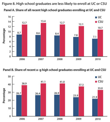 that among all high school grads, enrollment in state universities has declined by nearly a fifth since 2007, from 21.5 percent to 17.8 percent. And here’s even worse news: The enrollment rate among the highest qualified students, those who have completed the a-g requirements, has also declined by nearly a fifth, from from 67.5 percent to 54.9 percent. Both CSU and UC have seen enrollment declines.