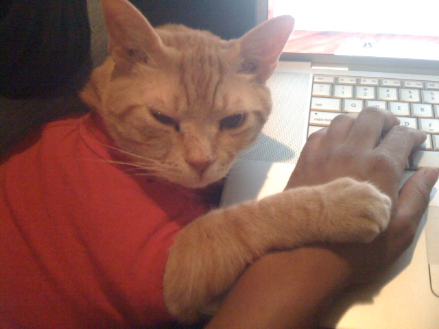 George is way more involved in the lives of the humans he shares his home with than any other cat I’ve encountered. Most cats ignore you, or only occasionally deign to hang out. But George is always all up in your business, trying to do what you’re doing. Including (actually, especially) when you’re trying to blog: