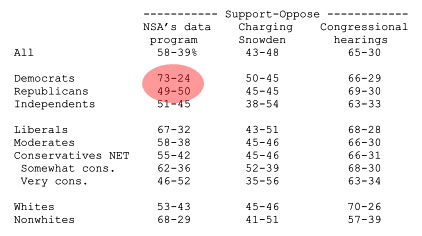 The public by 58-39 percent supports the NSA collecting “extensive records of phone calls, as well as internet data related to specific investigations, to try to identify possible terrorist threats.” Support for the program is far higher among Democrats and liberals than among Republicans and strong conservatives, reversing Bush-era political divisions on issues of privacy vs. security.