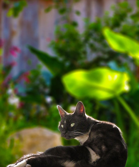 Anyway, I am nothing if not determined, in a lazy sort of way, and for weeks now I’ve been doing this late in the day when the sun backlights both garden and cat. Finally, a few days ago, I got a decent picture. Just this one. Enjoy.