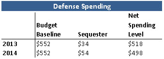 As you can see, the net spending level in 2014 is the same as 2013 because the budget baseline went up enough to make up for the increased sequester. But here are the numbers for defense discretionary spending: