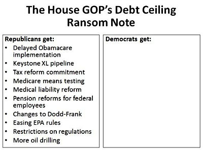 that would be politics as usual, to be fought along the usual lines. But demanding the elimination of a historic piece of social welfare legislation? Or the absurd ransom note on the right, courtesy of Steve Benen? That’s just not the same thing and everyone knows it. Unfortunately, the norms of the press don’t really allow them to say that. So you get story after story about all the previous government shutdowns, or about the various hobbyhorses that have been attached to debt ceiling legislation in the past, with the strong implication that, really, what’s happening today isn’t all that unusual.
