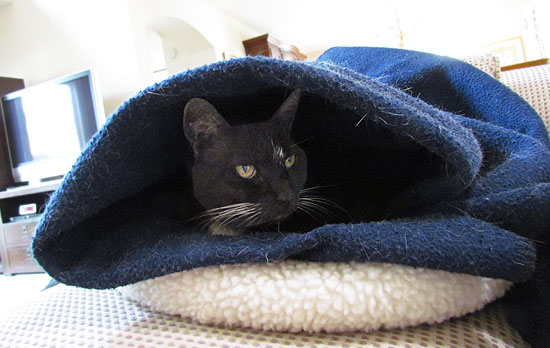 Last weekend’s rain has obviously traumatized Domino. Sunny skies may have returned to Southern California since then, but Domino has spent all week hiding in a blanket cave anyway, just in case the rain clouds return. Her humans failed her once, after all. There’s no telling when we’ll fail her again.