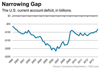 The U.S. current-account deficit sank to the lowest level in more than 14 years at the end of 2013, reflecting a smaller trade gap and better returns on assets Americans own abroad….The gap, which has narrowed 20% from a year earlier, now represents 1.9% of U.S. gross domestic product. That’s the smallest shortfall as a share of the U.S. economy since 1997.
