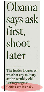 Congratulations to the LA Times copy desk for the brilliant front-page headline on the right (print edition only). In the obligatory bland tones of a straight news piece, it perfectly captures both President Obama’s approach to military intervention as well as the approach of the war-is-always-the-answer faction of the Republican Party. And the accompanying story isn’t bad either: