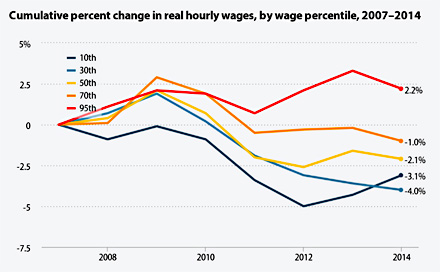 - Every group has seen a cumulative drop in wages since 2007 except for the top 5 percent (red line).