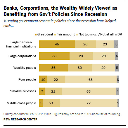 That’s amazing. Even those with high incomes agree that wealthy people benefited the most from government policies and that the poor and middle class got bupkis. Even Republicans largely agree that this has been the case.