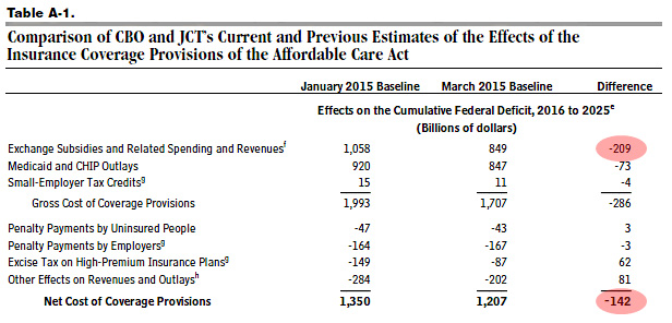 Here’s some good news: the latest report from the CBO has reduced its estimate of the cost of Obamacare. This is due partly to a slight decrease in the number of people CBO expects to be covered, but mostly due a lower estimate of the cost of insurance premiums. Thanks to this, federal subsidies are estimated at $209 billion less over a ten-year period, and the cost of CHIP and Medicaid is estimated at $73 billion less. However, there are also reductions in expected revenues from Obamacare’s excise tax, so the net reduction amounts to $142 billion over ten years. The table below tells the story.