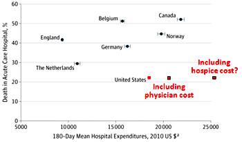 To my gimlet eye, this looks like four bad things and one good thing: our hospitalization rate is lower than in other countries. That really is good news, and is probably the result of better hospice and palliative care. Still, our hospitalization rate isn’t a lot lower. We’re making good progress on this, but it’s not really something to crow about too much.