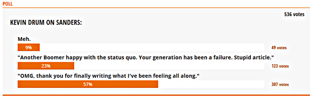 There was almost literally nothing in between. Either fulsome praise or utter contempt. I need to think some more before I figure out what to make of this: It’s dangerous to assume Twitter reflects the larger progressive community, but it might be equally dangerous to write it off as meaningless. It certainly seems to suggest an even stronger chasm in the Democratic Party than I might have suspected, and possibly more trouble down the road if it also reflects a stronger loathing of Hillary among white millennials than I’ve previously suspected. But I’m not sure.