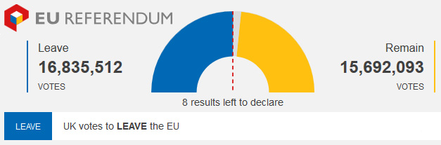 British voters have voted to leave the EU. What a waste. I’m skeptical that this will cause economic Armageddon, but I doubt that it will do Britain any good either. Now they’ll spend the next three or four years up to their gills in rancorous negotiations on the terms for exit, and all to accomplish next to nothing.