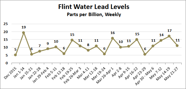 Here is this week’s Flint water report—late but not forgotten, due to some kind of weird screw-up at the Michigan DEQ site. First they didn’t have the data. Then eventually they did, but the spreadsheet was unreadable. Then they took everything down entirely. Then they finally reposted last week’s data. As usual, I’ve eliminated outlier readings above 2,000 parts per billion, since there are very few of them and they can affect the averages in misleading ways. During the week, DEQ took 392 samples. The average for the past week was 11.10.