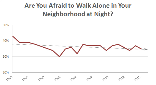 But as the redoubtable Paul Manafort says, what about how people feel? Do they feel safe? That’s a hard question to answer, but Gallup asks it every year. Here’s the latest. I’ve included Excel’s trendline just to make it clear which direction this is going: