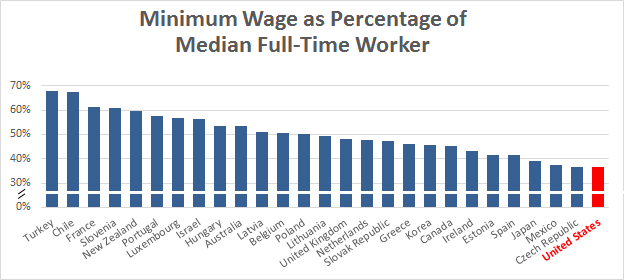 In countries like France, Australia, and Britain, the minimum wage is equivalent to about half or more of the median wage. In the US, it’s equivalent to only 37 percent of the median wage. That’s the lowest in the OECD dataset.
