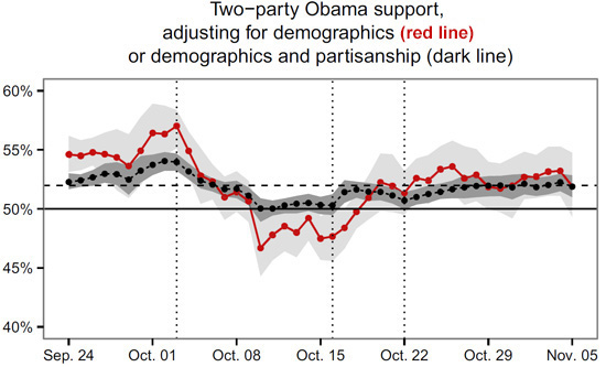 The first dotted line is the first debate. Remember how Obama did so poorly and plummeted in the polls? It turns out he didn’t, really. Obama fans just stopped responding to polls, producing the illusion of a 10-point collapse. In reality, he only dropped about 4 points. In fact, during the last six weeks of the campaign, Obama’s support was never more than a couple of points away from 52 percent.