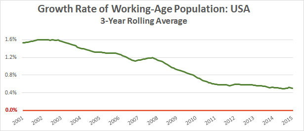 And then there’s Japan. Their working-age population is also declining, but it didn’t even start the 21st century in positive territory. Currently their working-age population is growing at the rate of -1.2 percent per year:
