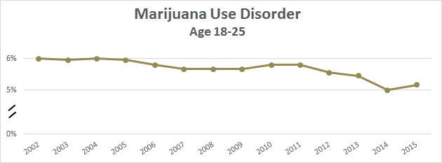 That sounds like a lot. On the other hand, if half of daily marijuana users typically have substance use disorders, that’s about 6.5 percent in Colorado. Here are the national figures for the past decade: