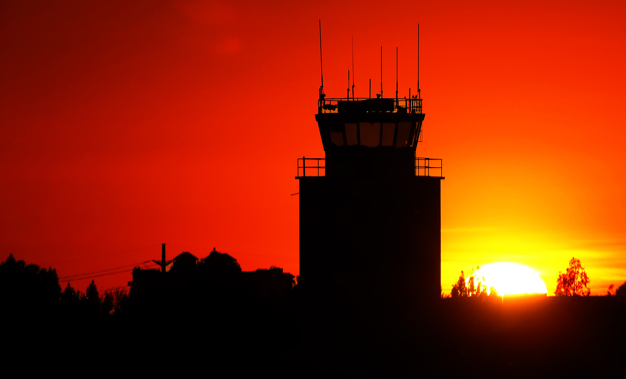 Here is last night’s sun setting over the old Marine Corps Air Station in Tustin, which was shuttered as part of the 1994 base closings. Its two World War II blimp hangars were left intact, and so was the old control tower. I guess blimps need control towers too. In the end, I narrowed down all the photos to two, but then I couldn’t make up my mind between them. I like the composition of the bottom one better, but the colors of the top one are exquisite. So today you get both.