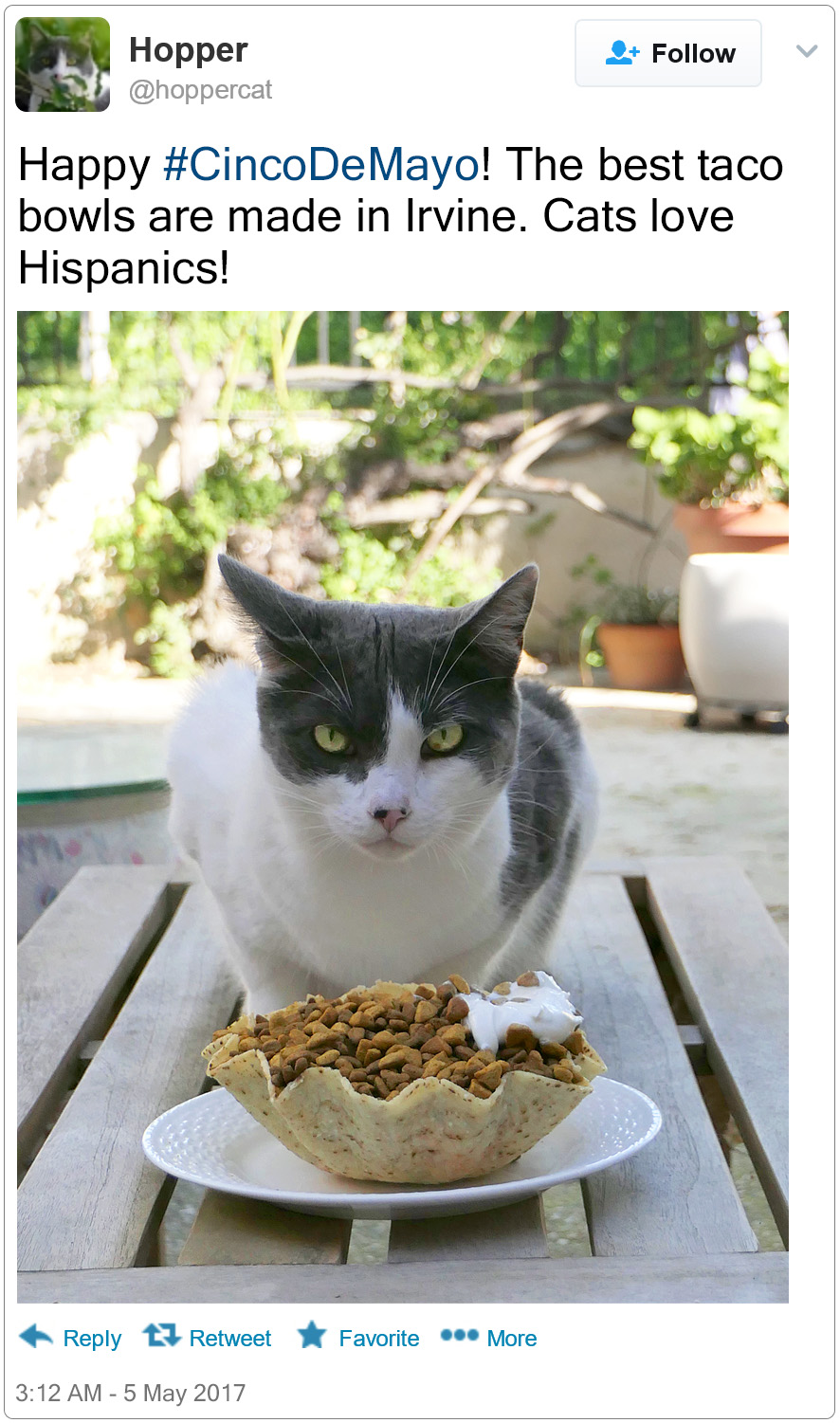 So then I went to one of Irvine’s leading supermarkets and bought a box of tostada shells. $4.99! I filled one up with cat food and then added a dollop of sour cream for that authentic south-of-the-border flavor. Hilbert still wasn’t having any. Luckily, Hopper was intrigued by the sour cream. She jumped up and started licking it, and thanks to the burst mode on my camera I got 40 or 50 shots of this. Within minutes my homage was finished. Enjoy!
