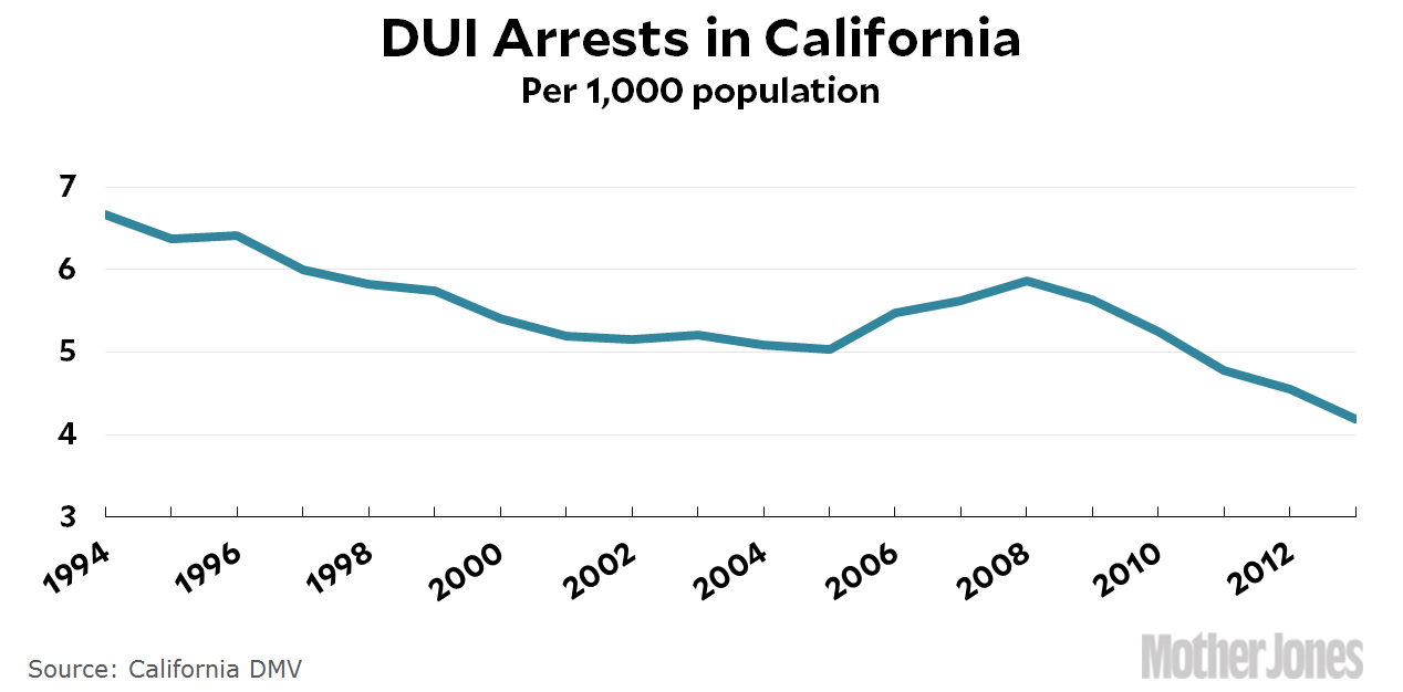 I’m sure that nationwide data for this is available somewhere, but I’m not sure where. In any case, I imagine that California is pretty typical, and the data on DUI arrests sure doesn’t suggest that police activity toward drunk driving has gotten a lot more severe over the past couple of decades. Just the opposite, in fact. Of course, this decline in arrest rates is partly because there are just fewer drunk drivers to arrest, thanks to social stigma etc. Right? National data doesn’t really back that up: