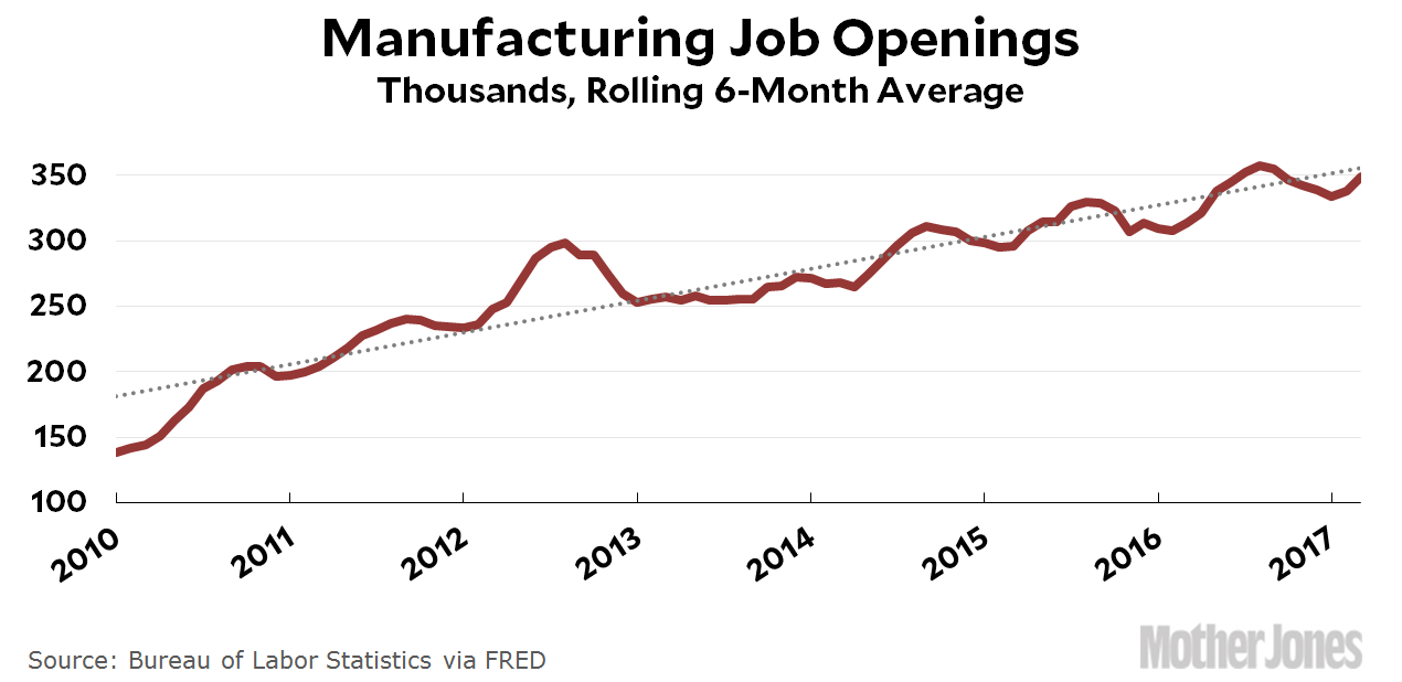Meh. Manufacturing job openings have been declining since 2012, but have shown a small uptick since the start of 2016. Nothing to get excited about, though.