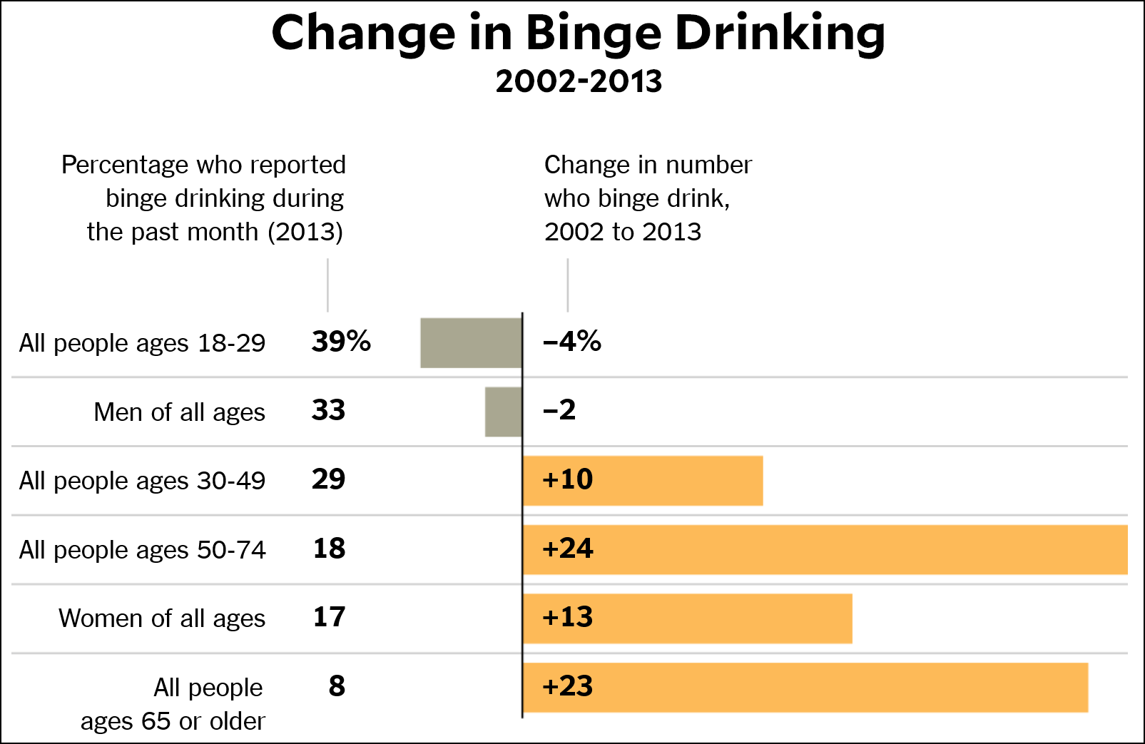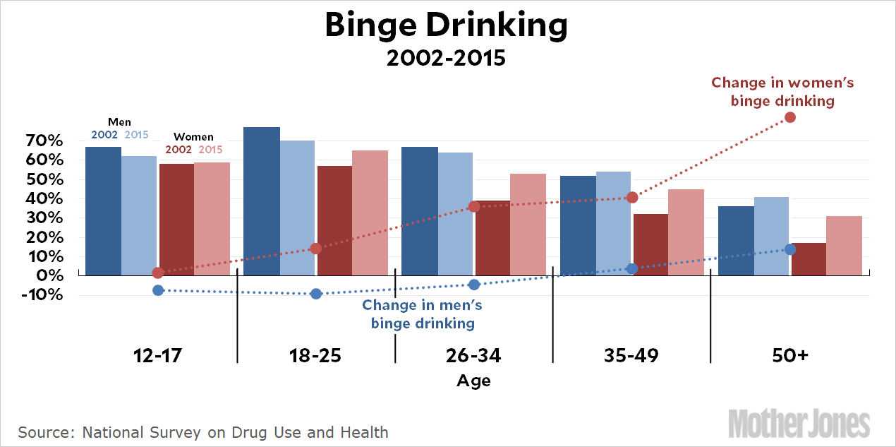 I dunno. But my reader had a different complaint. Take the bar for women over 50. The number who report binge drinking in the previous 30 days has gone up from 17 percent to 31 percent. What’s the best way to represent that? It’s a difference of 14 percentage points, but 82 percent. I think the latter is more informative, but it’s always confusing when you compare percentages. It’s easy to see that an increase from, say, $17 to $31 is 82 percent, but less intuitive that an increase from 17% to 31% is also 82 percent. But it is.