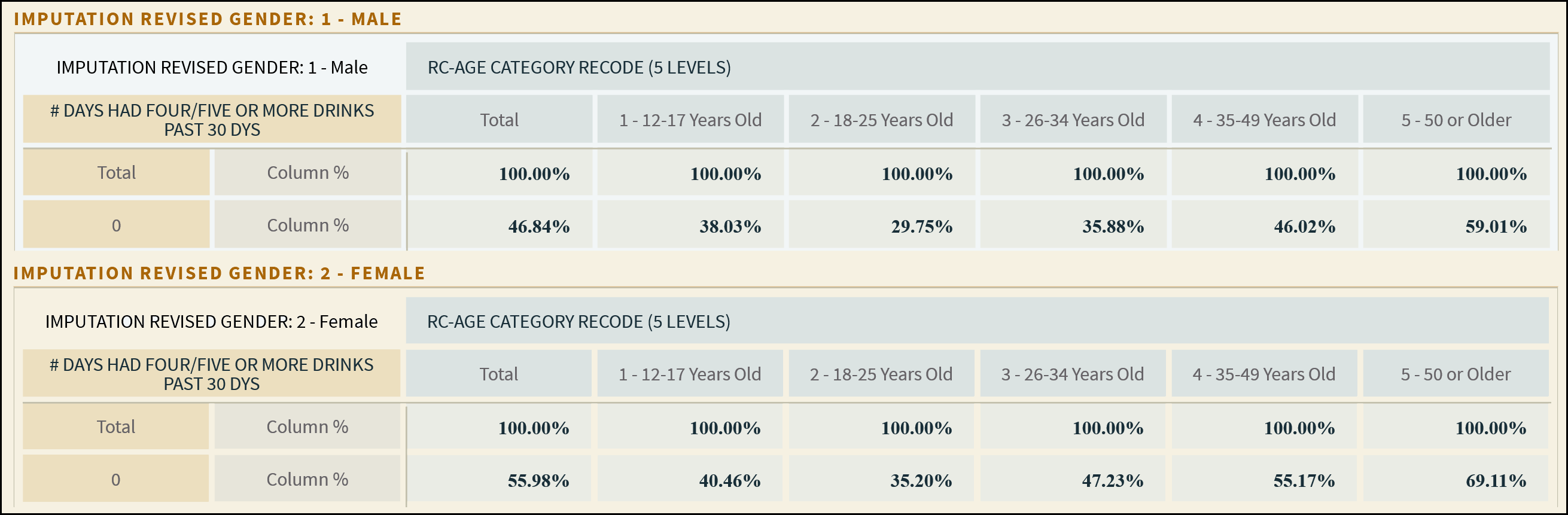 If 46.84 percent of males reported zero days of binge drinking, then 53.16 percent reported binge drinking at least once. But the Times chart says 33 percent. I don’t know what’s going on.